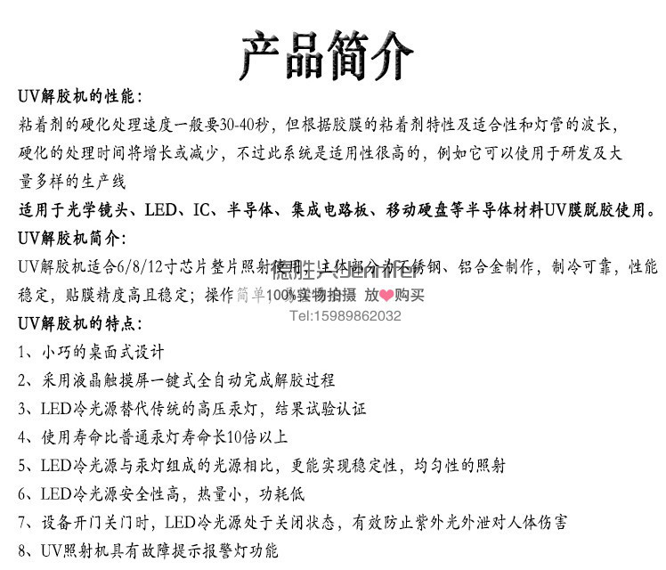 例如它可以使用于研发及大量多样的生产线 适用于光学镜头、LED、IC、半导体、集成电路板、移动硬盘等半导体材料UV膜脱胶使用。