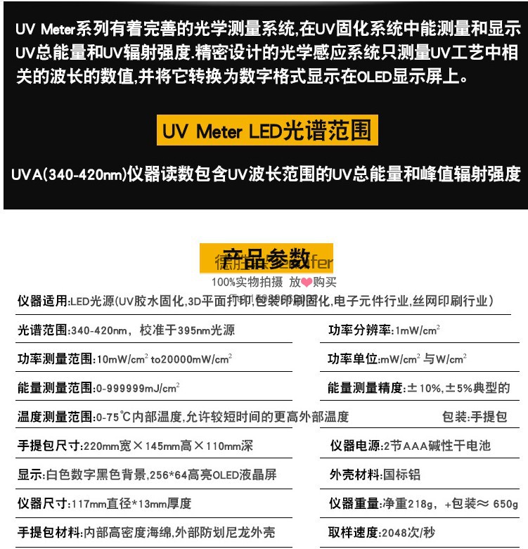 UV Meter LED光谱范围是:340-420nm。可定制其他波段。仪器读数包含UV波长范围的UV总能量和峰值辐射强度。