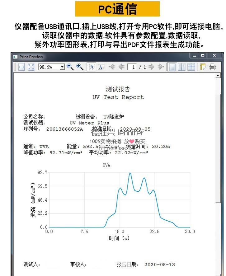仪器配备USB通讯口,插上USB线,打开专用PC软件,即可连接电脑,读取仪器中的数据。软件具有参数配置,数据读取,紫外功率图形表,打印与导出PDF文件报表生成功能。