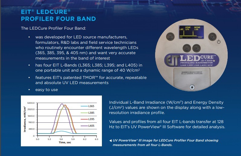 EIT has developed a line of LED UV measurement instruments specifically designed and engineered with a response (L-Band) to accurately, reliably and repeatability measure industrial UV LEDs. EIT LED radiometers are NIST traceable and are available in different LED specific responses or L- Bands.